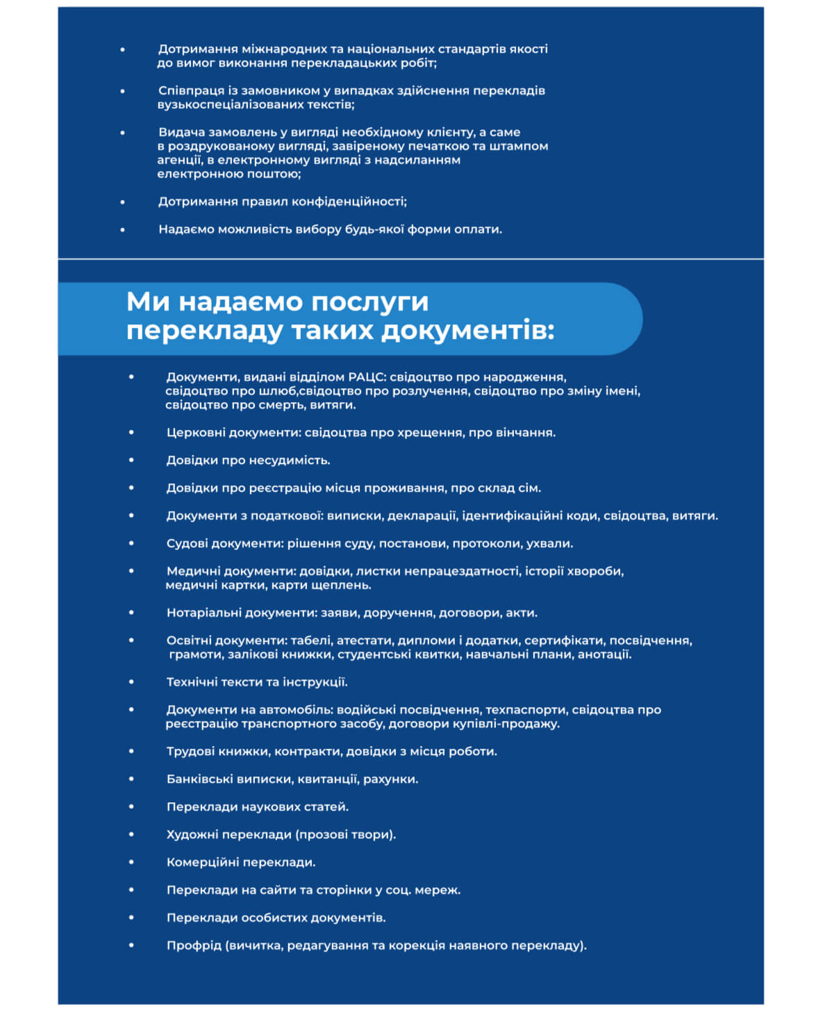 - Дотримання міжнародних та національних стандартів якості до вимог виконання перекладацьких робіт;